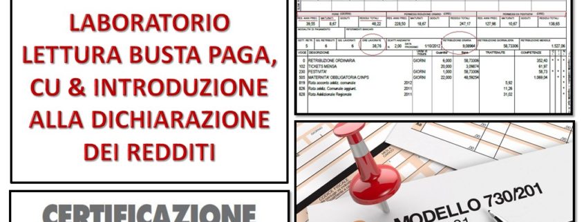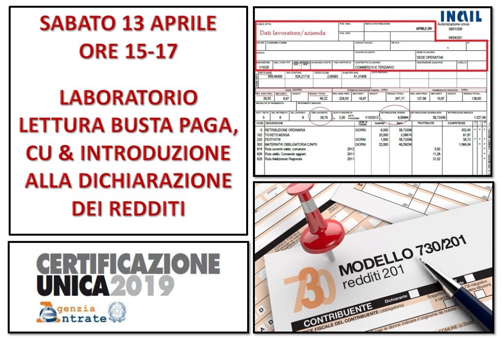 Ricordiamo che sabato si terrà un laboratorio sul lavoro. Si imparerà insieme come leggere una busta paga, Certificazione Unica (anno 2019) e introduzione alla dichiarazione dei redditi.